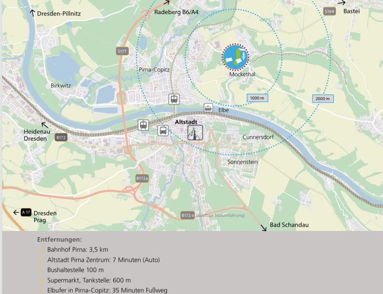 Die Pirnaer Altstadt ist nur 3 km entfernt, die Infrastruktur in Pirna-Copitz beginnt fast angrenzend und bietet kurze Wege zu Einkaufsmöglichkeiten, Schulen und Sportstätten. Mehrere überörtliche bzw. Stadtbuslinien vernetzen den Standort ausgezeichnet mit seinem Umfeld.
